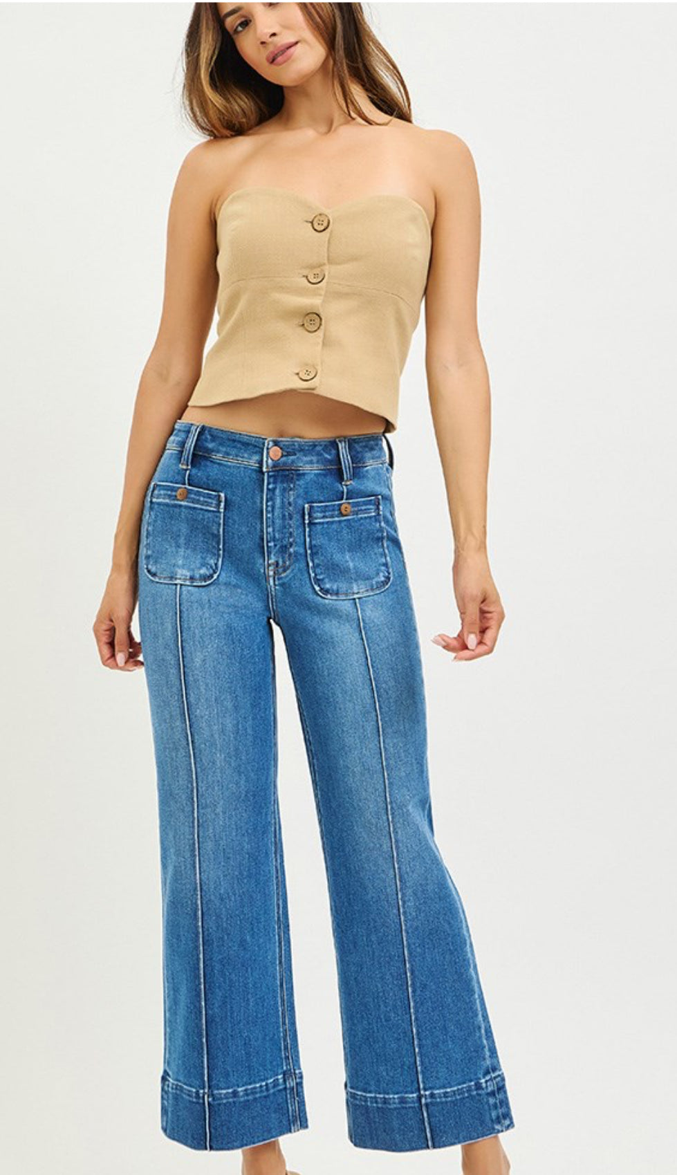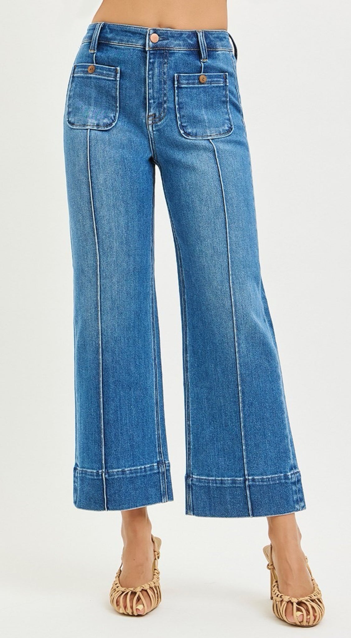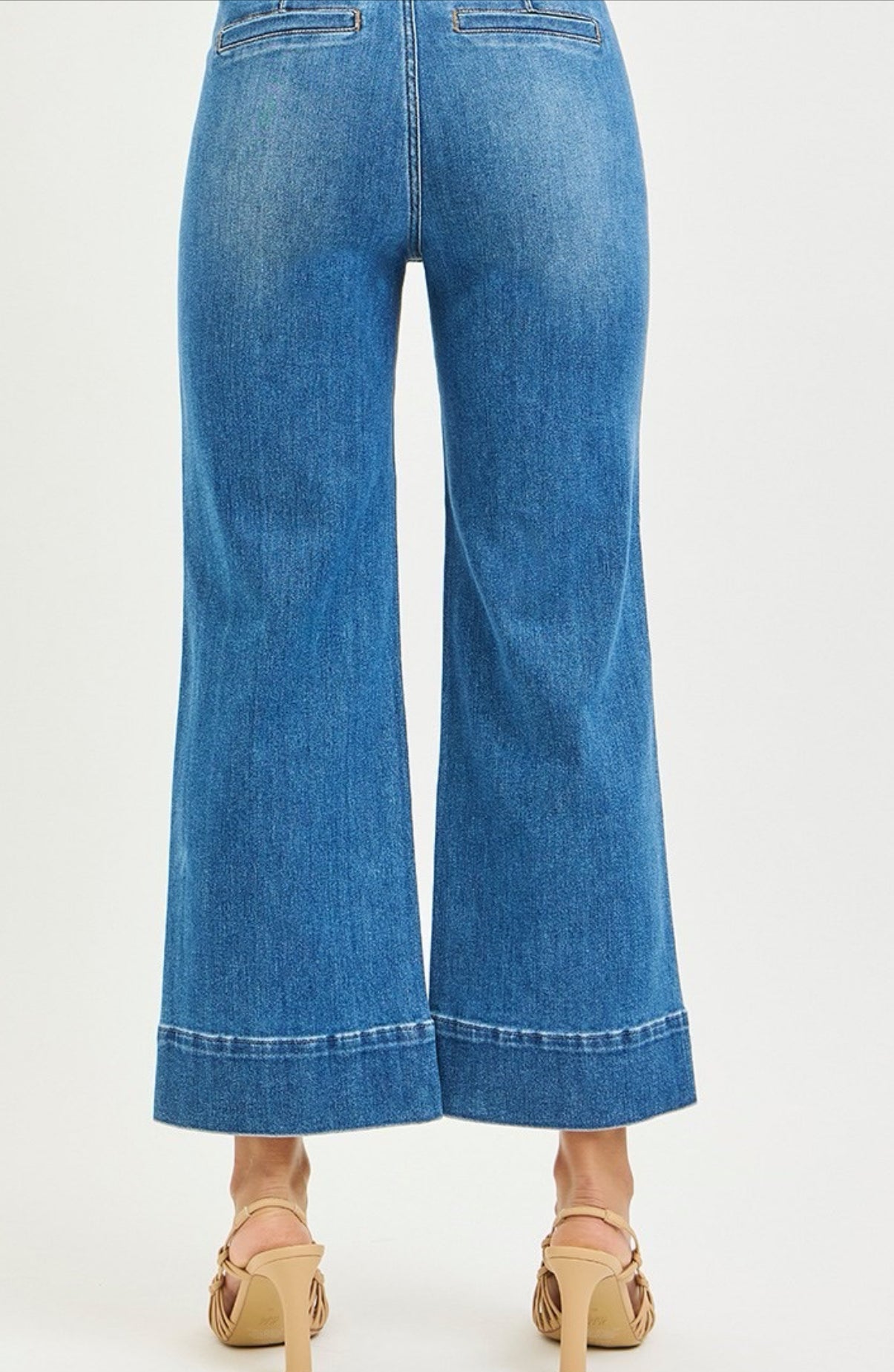 HIGH RISE CROP WIDE JEANS WITH FRONT PINTUCK AND PATCH POCKET DETAIL- Rise 10 1/2"...