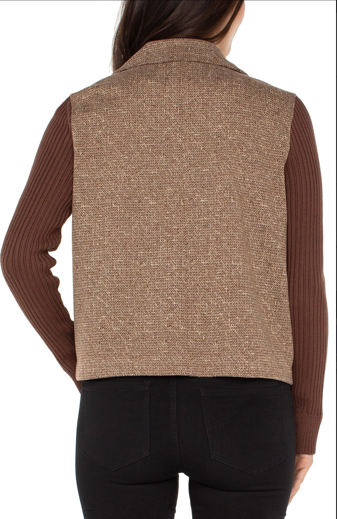 This shacket pairs a clean woven base with soft sweater-knit sleeves for a fresh play...