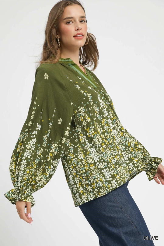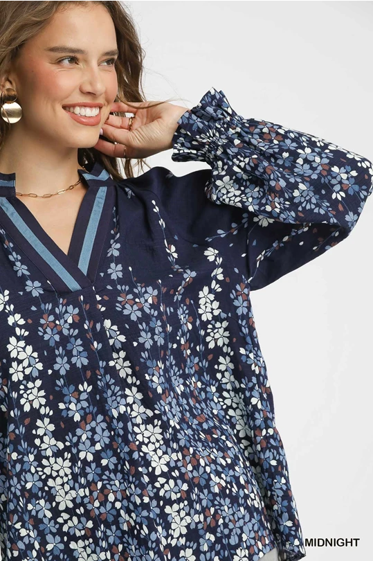 This floral vine print blouse combines elegance and comfort with its split V-neck and long...