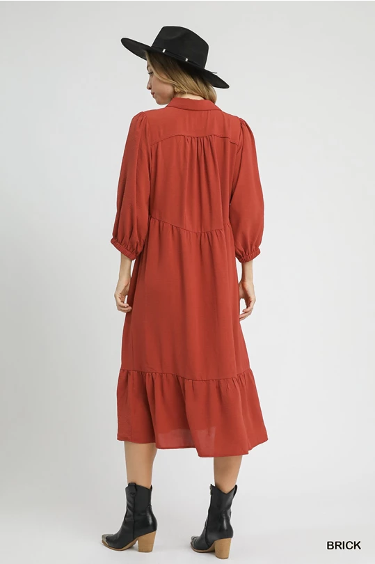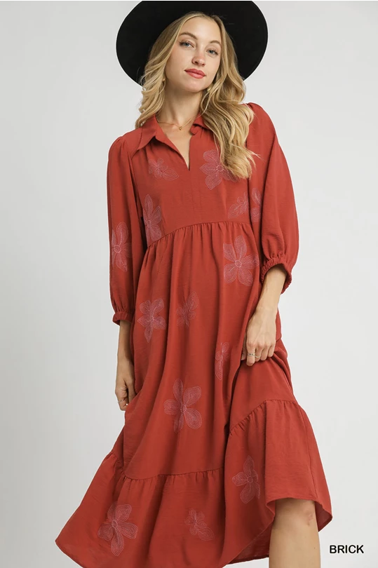 This embroidered floral tiered midi dress features a collared neckline with a subtle v-split front,...
