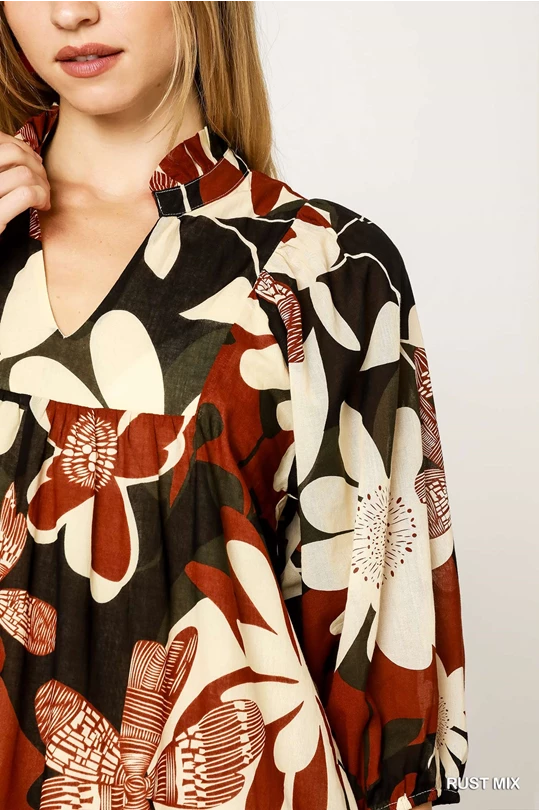 This Floral Boho Blouse features a refined V-neck highlighted by a delicate ruffle trim, enhancing...