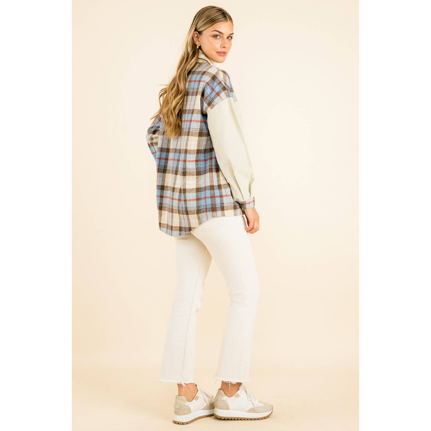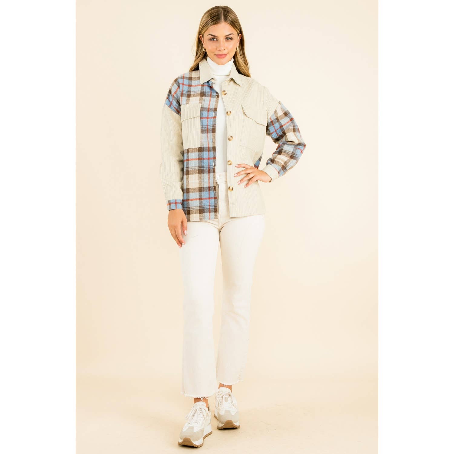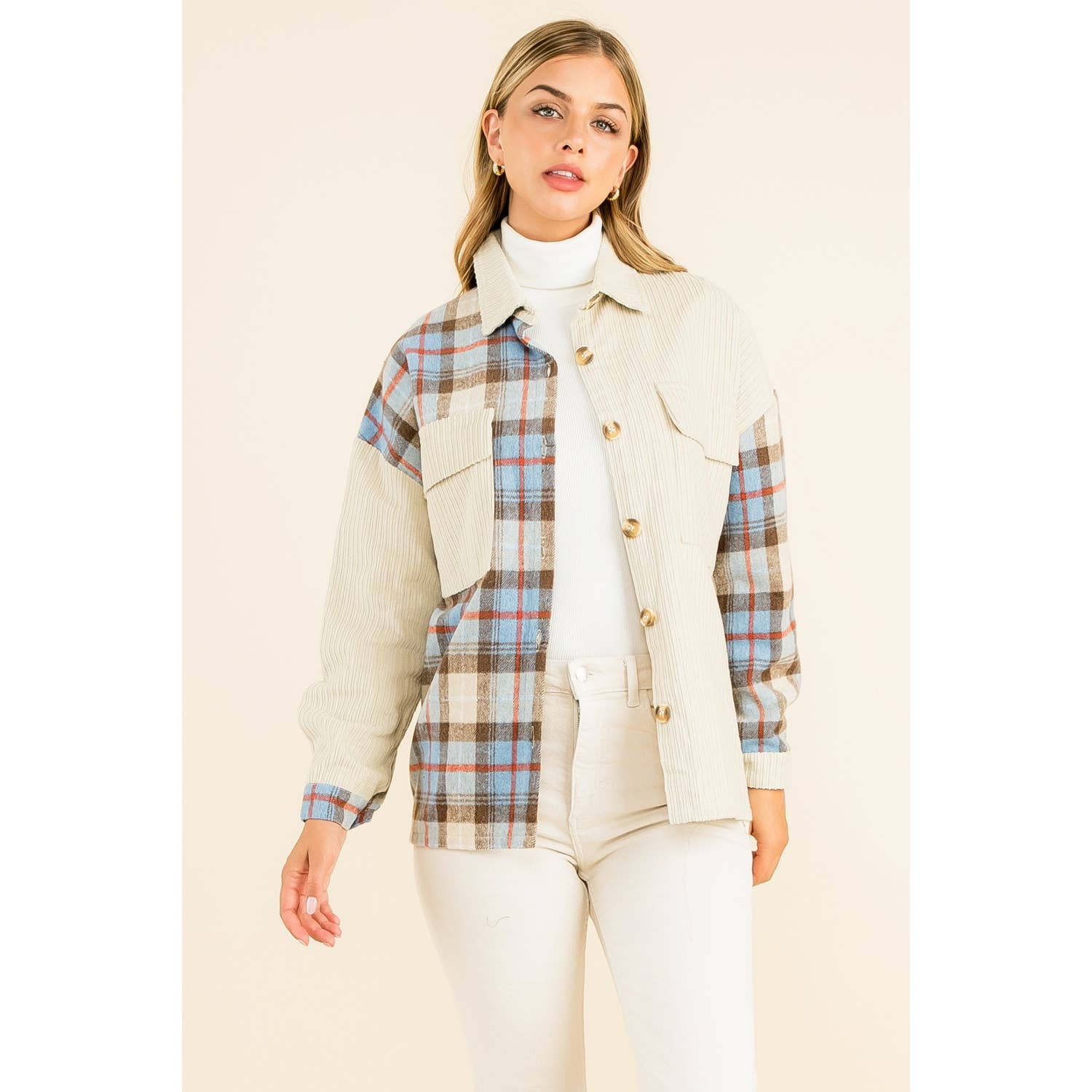 The Mixed Media Button Up Jacket in Beige offers a refined blend of textures for...