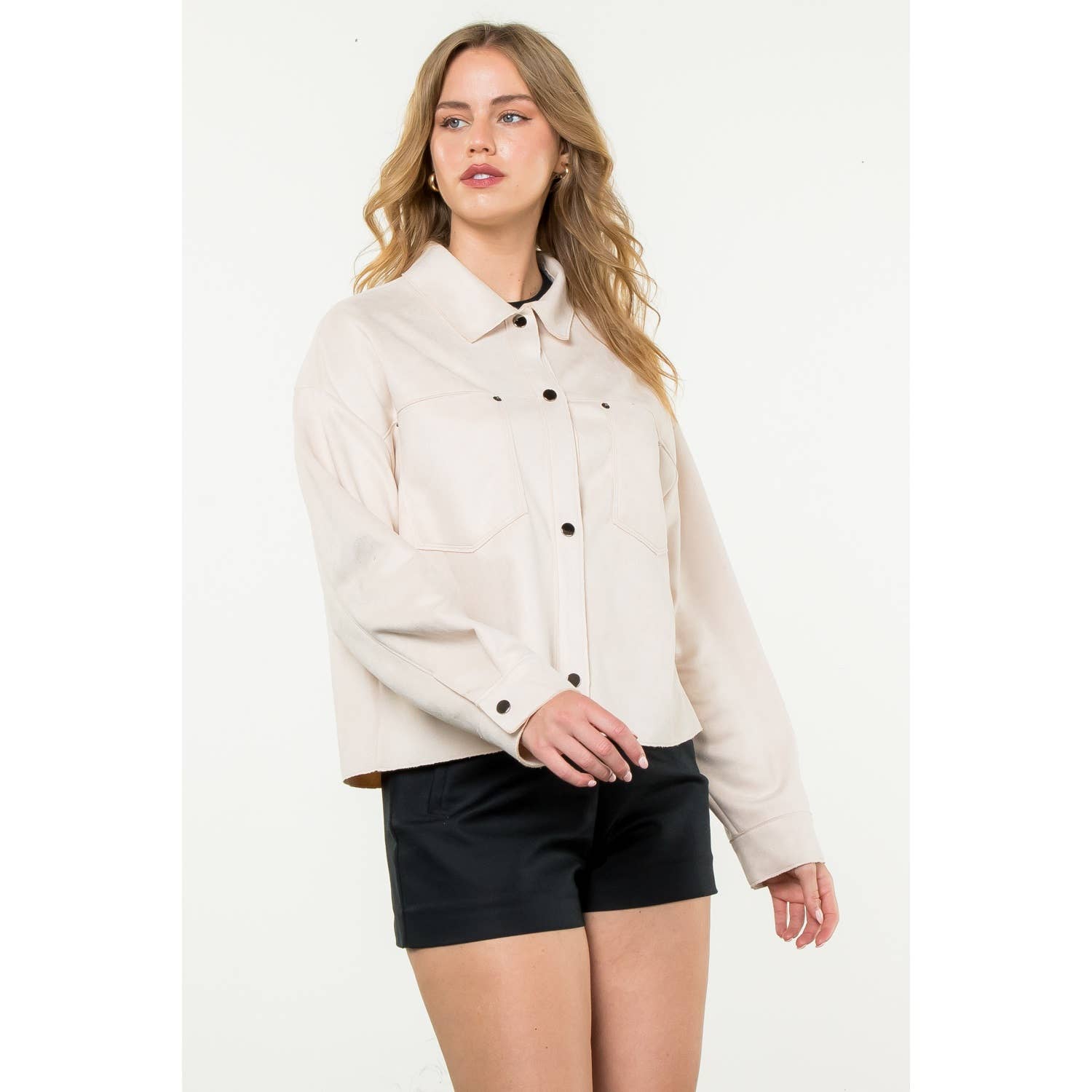 This Button Up Suede Jacket in cream combines style with comfort through its woven fabric...