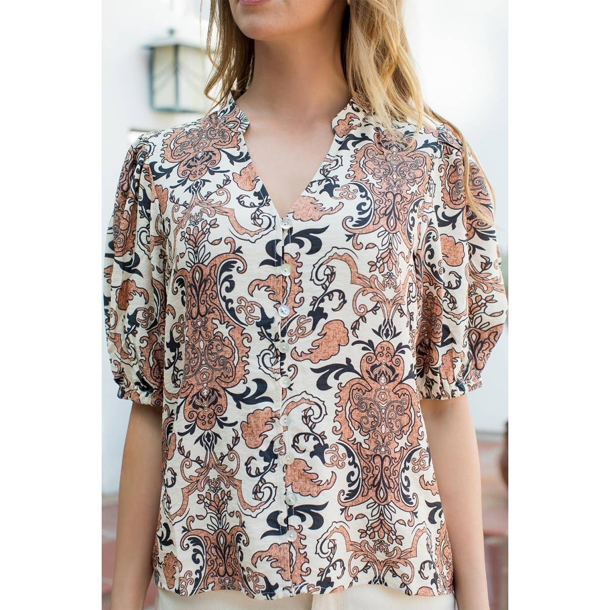 THML This beige paisley print top features elegant puff sleeves and a classic button-up design,...